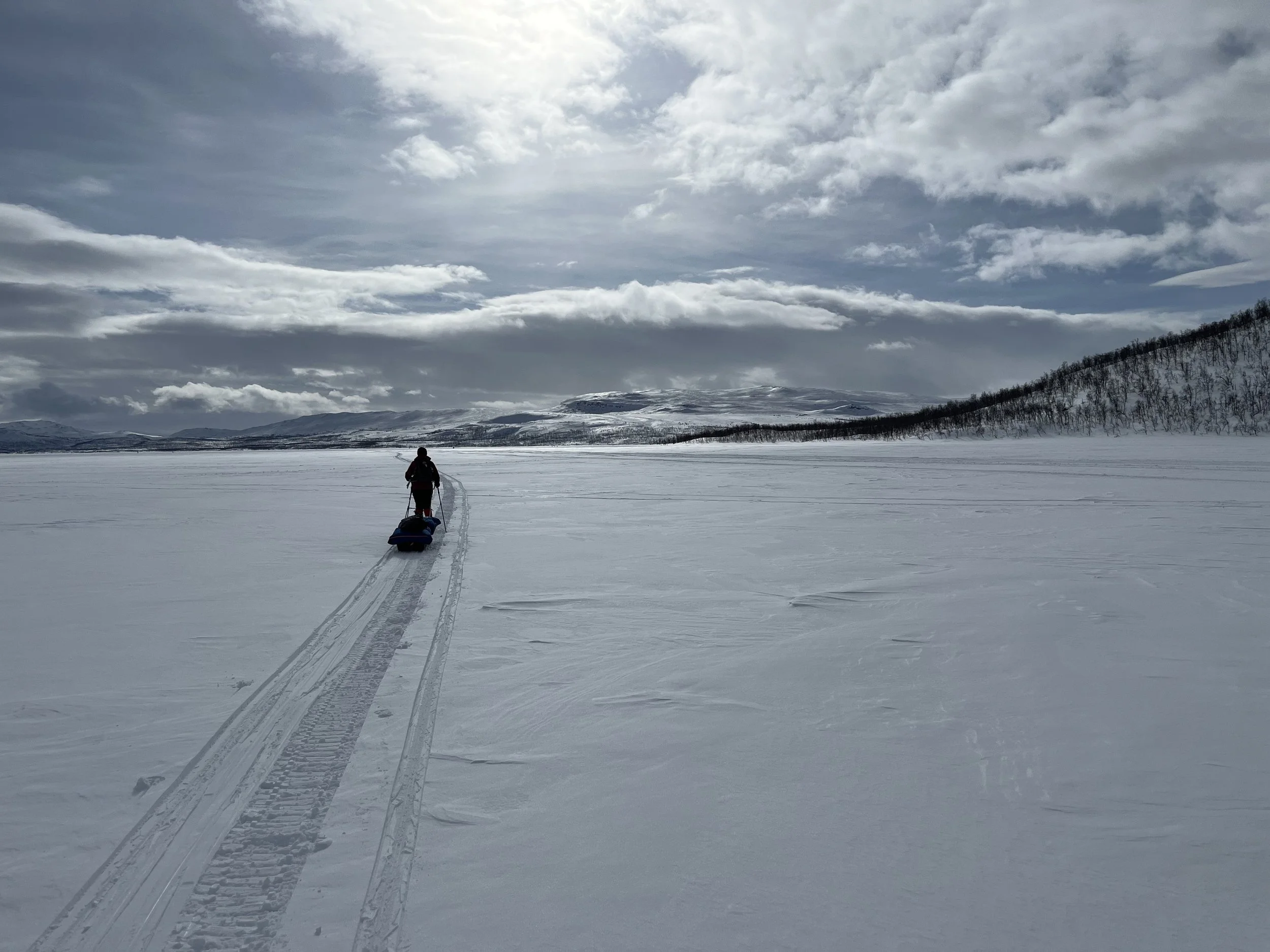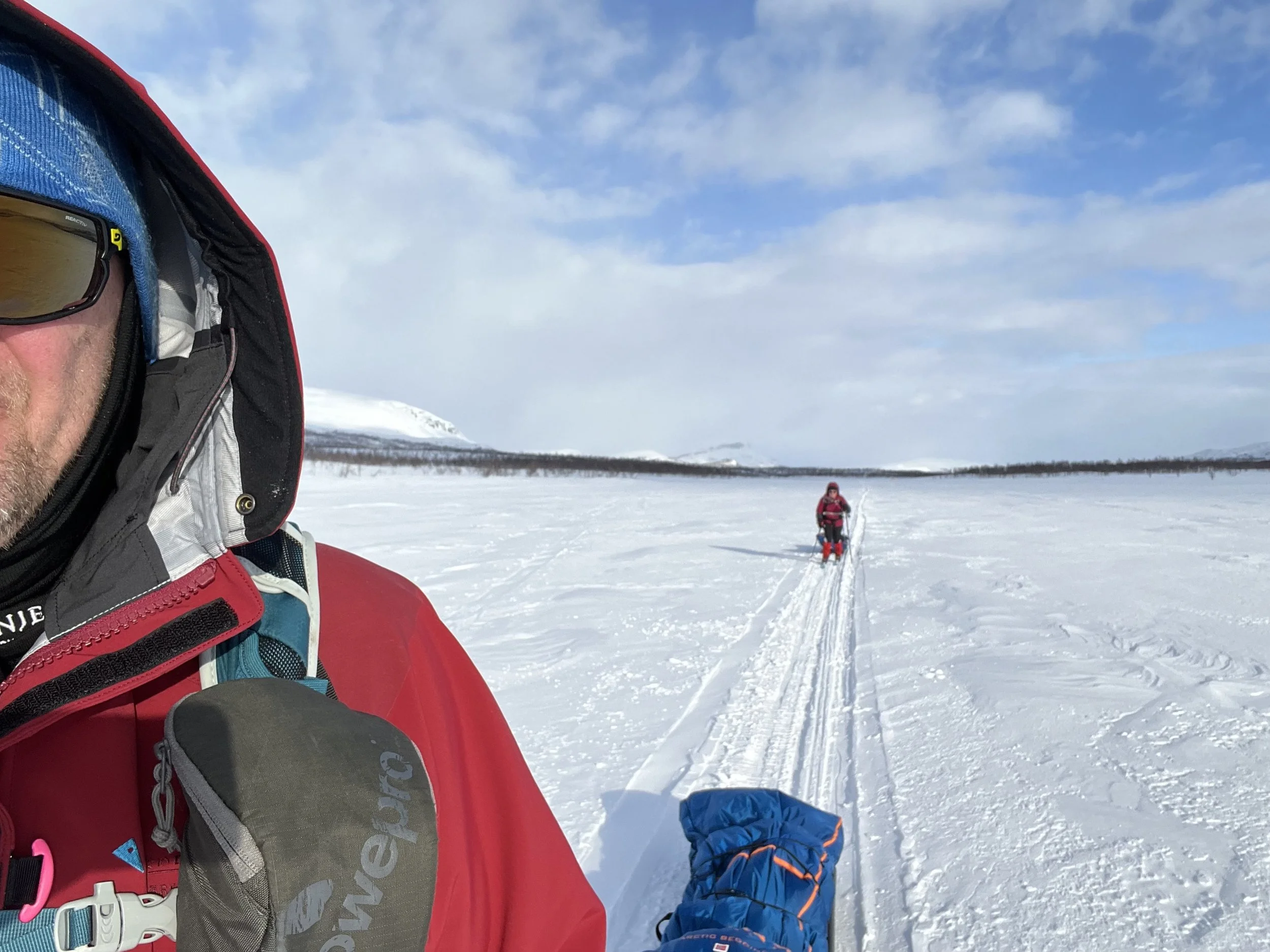 På veg over Kilpisjärvi. En mil på flat is, og så bør det ikke være langt bort til Treriksrøysa.