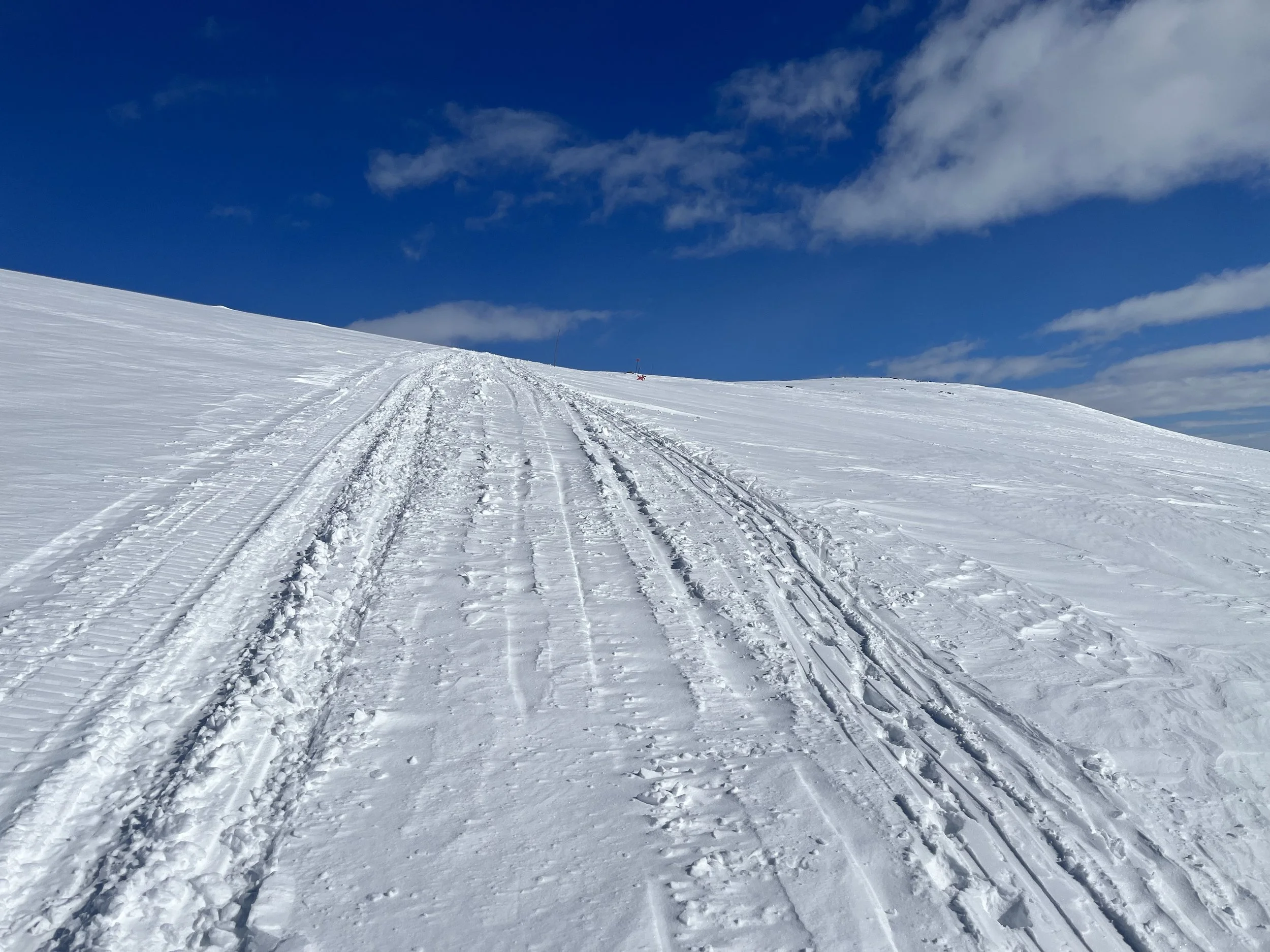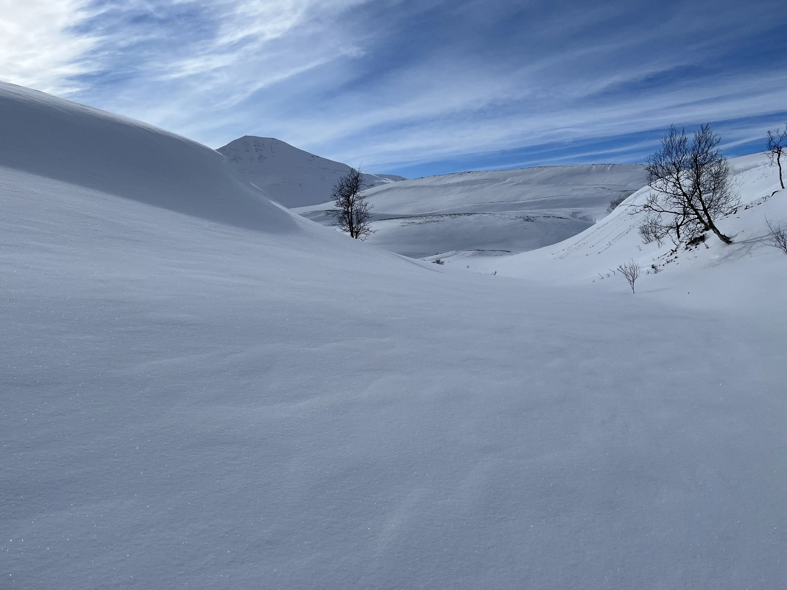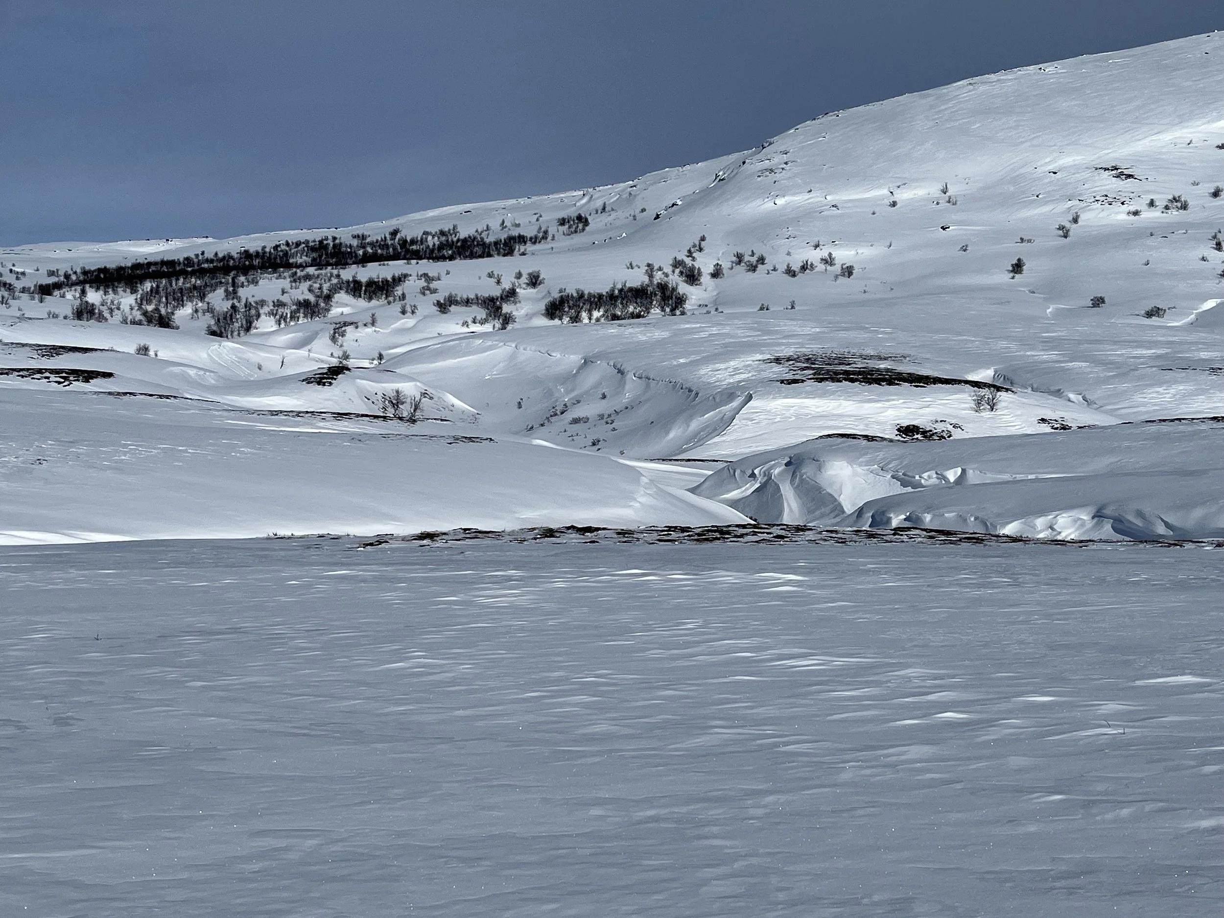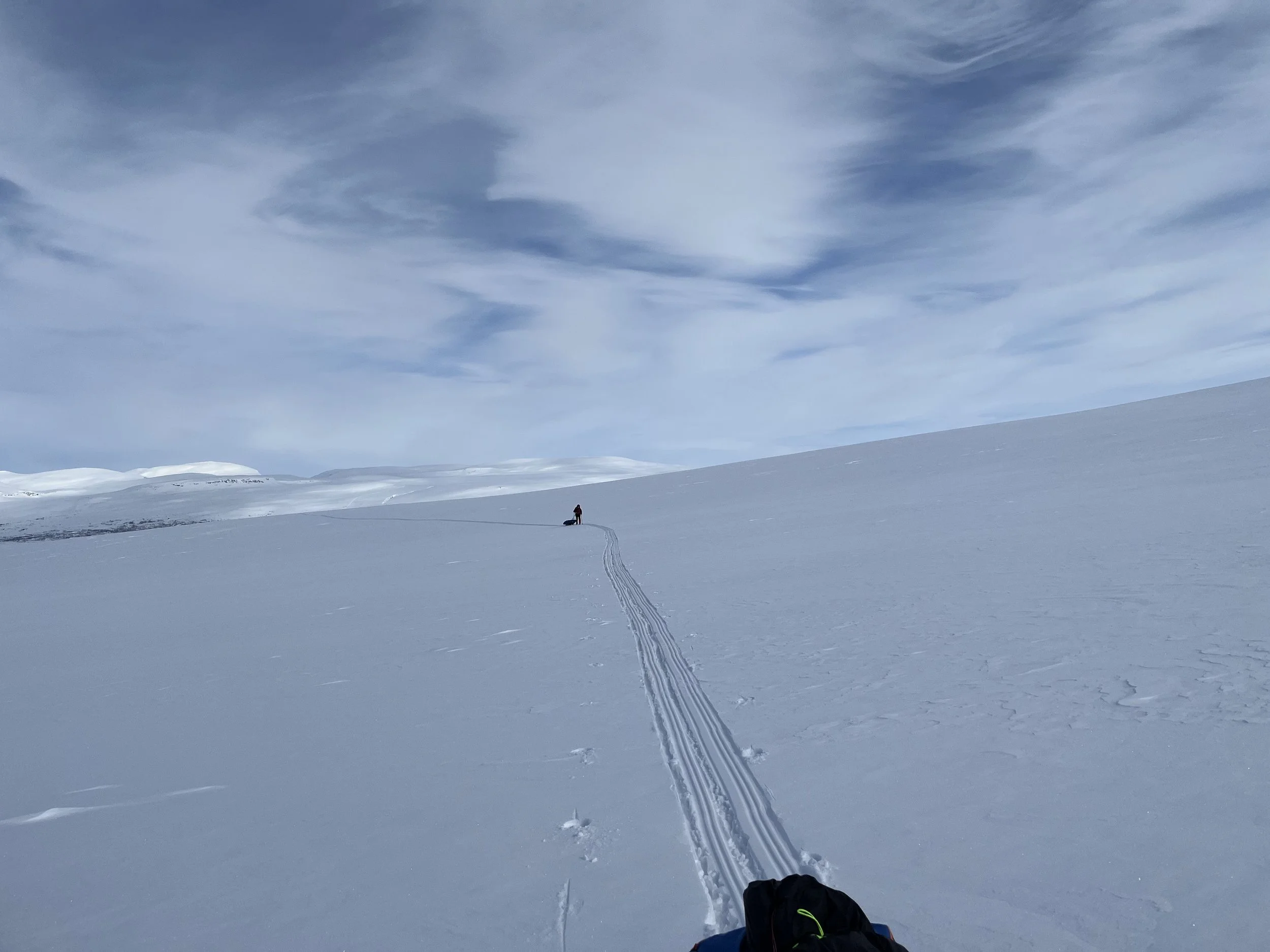 Ny dag. Noen få minus og nesten vindstille. Nydelig å finne flyten, la timene og kilometerne gå, kjenne at kroppen virker mens hodet får hvile.
