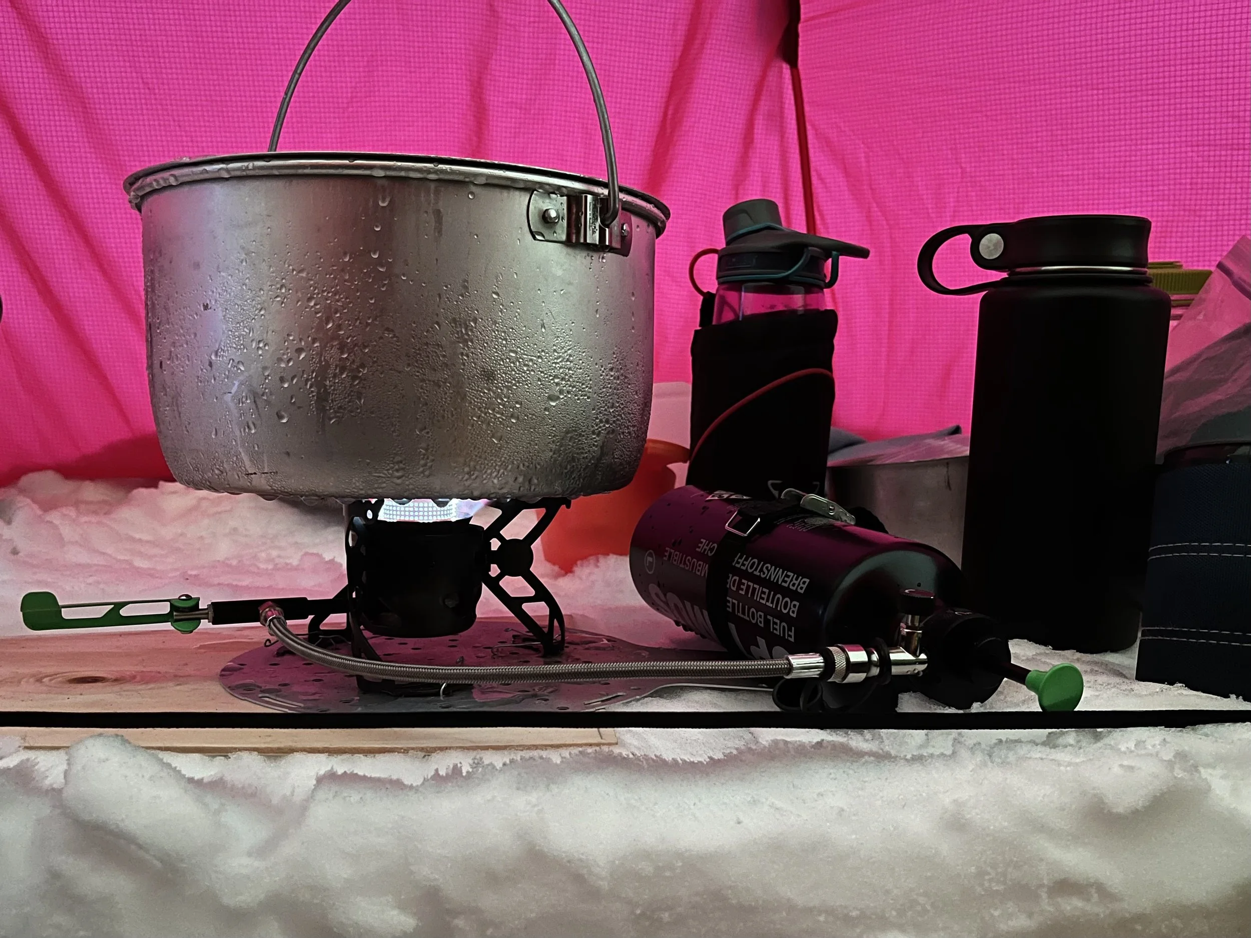 På disse turene er vi helt avhengig av en driftssikker brenner, og ei stor god gryte for å smelte snø. Hver tur ender vi opp med å nevne Svigerbror Asle som ga snøgryta i julegave til Ingeborg for noen år siden.