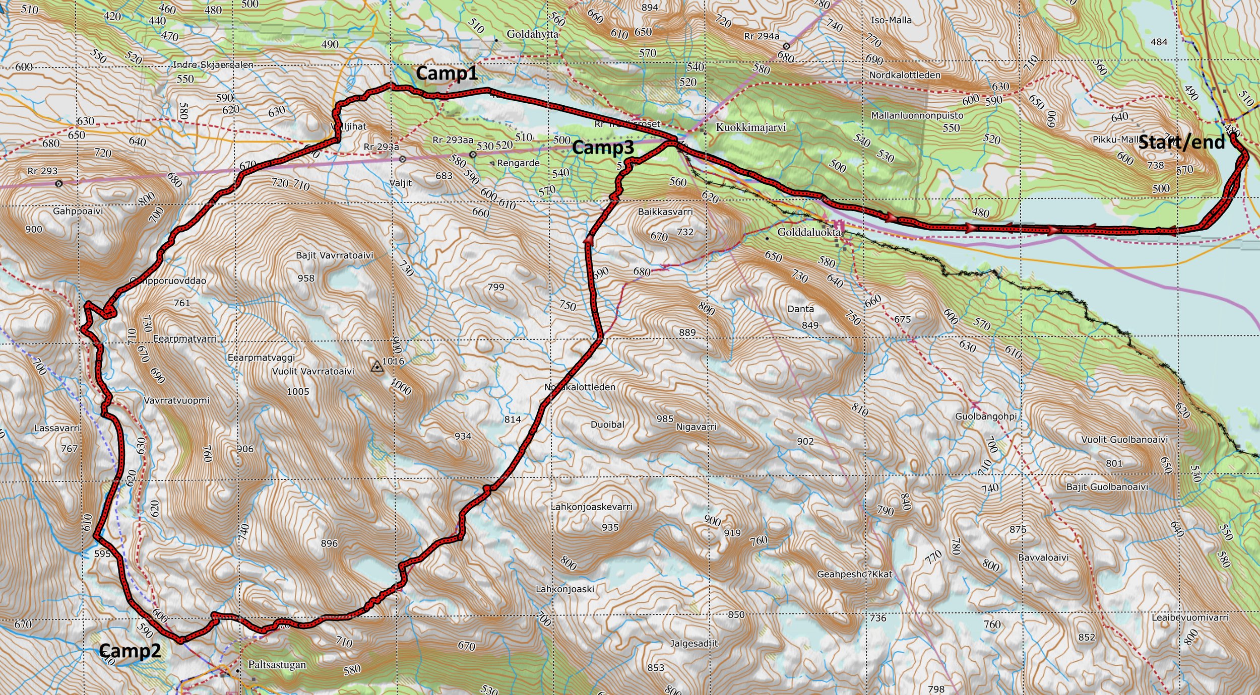 Fra Kilpis til Treriksrøysa og videre til vestsiden av Golddajavri.